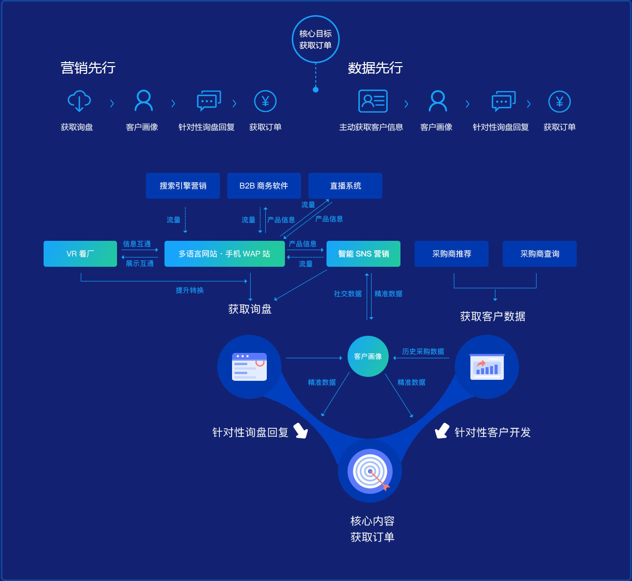 由Google首页关键词排名、Google Images 和 Google Video 排名、直播系统、客户画像、全球采购商推荐、全球采购商查询、外贸快车商务软件、SNS营销以及外贸实战培训组成的外贸快车智能网络营销矩阵,更大限度地在一个系统内涵盖全方位的网络营销渠道,真正实现了以大数据和云计算为基础的智能网络营销。